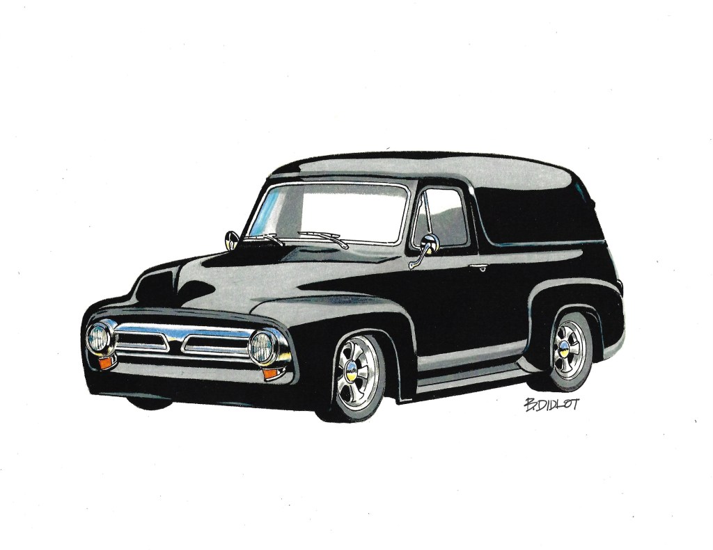 1956 FORD DELIVERY…RENDERING IN COLORED PENCIL AND INK.